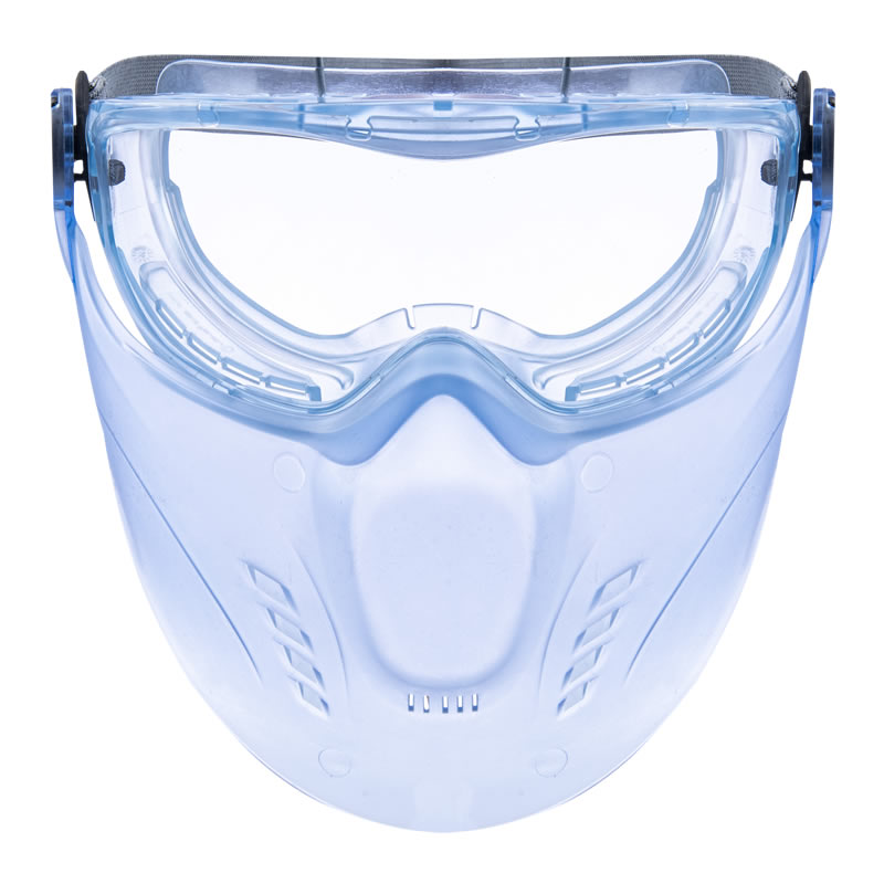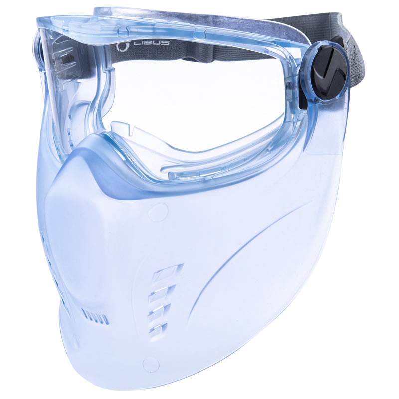 Lente de policarbonato de grado óptico con filtro UV. Marco de PVC. Banda textil elástica. Puente nasal integrado al marco. Ventilación indirecta. Máscara facial en policarbonato. Tratamiento anti-empaño (AF).