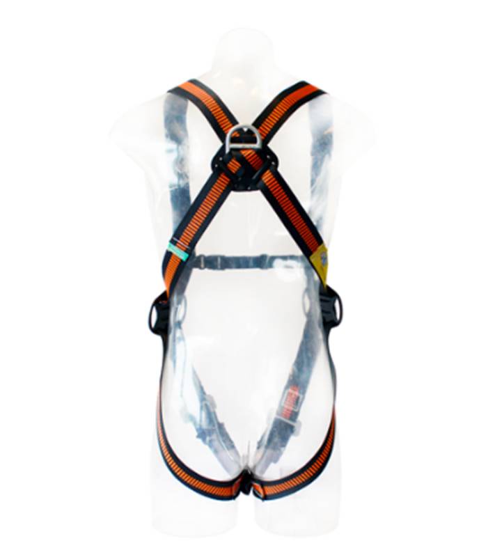 Cinta bicolor para facilitar la colocación del arnés. Diseño ergonómico para facilitar los movimientos del usuario. Pasadores plásticos para retención de la cinta sobrante una vez ajustado el arnés