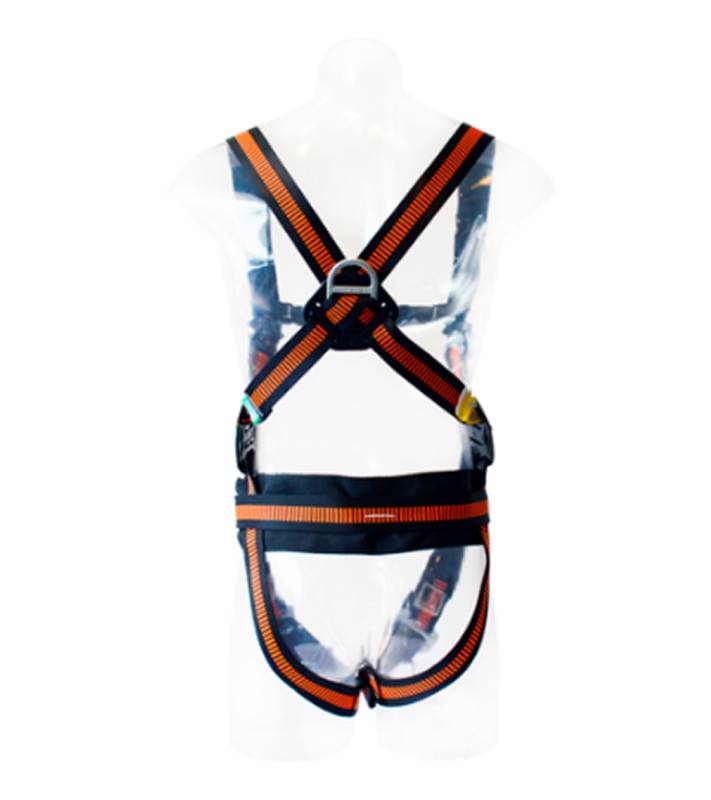 Cinta bicolor para facilitar la colocación del arnés. Diseño ergonómico para facilitar los movimientos del usuario. Pasadores plásticos para retención de la cinta sobrante una vez ajustado el arnés.