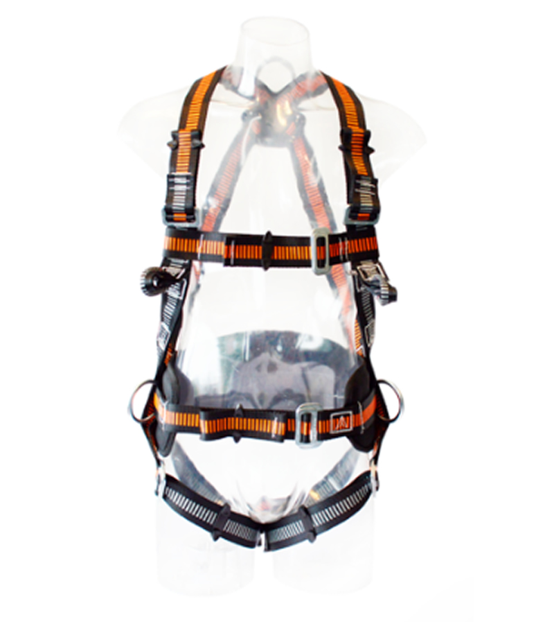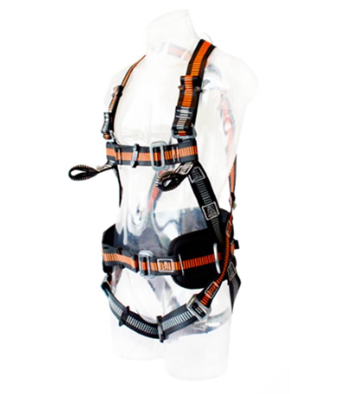 Arnés con 4 puntos de conexión, faja lumbar acolchada, diferenciación de colores en cintas de piernas y cintura para facilitar su colocación. Ex WXEHA12132.