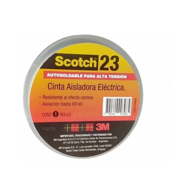 La cinta Scotch™ 23 de 3M posee una base o soporte de goma de etileno-propileno. Excelentes propiedades eléctricas. Dichas propiedades no se ven afectadas por el grado de elongación al aplicarla. Auto-soldable apto hasta 69 kV. Compatible con todos los materiales aislantes de cables. Separador (Liner) Especial de poliéster de fácil desprendimiento por tracción