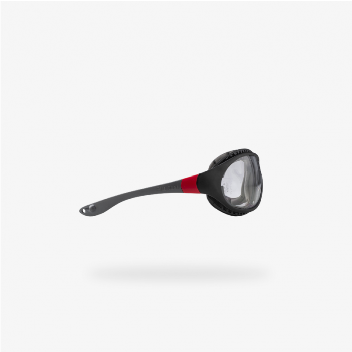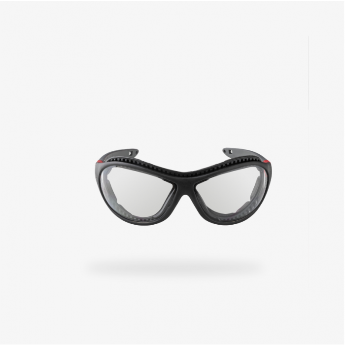 Diseñado para proteger el ojo contra golpes, impacto de partículas, polvo y chispas. Lente de policarbonato de grado óptico con filtro UV. Patilla intercambiable con correa elástica. Patilla telescópica con 5 posiciones de regulación. Armazón interno desmontable con guarnición espumada soft. Puente nasal integrado. Marco integral. Protección lateral. Patilla. Tornillo de acero inoxidable.