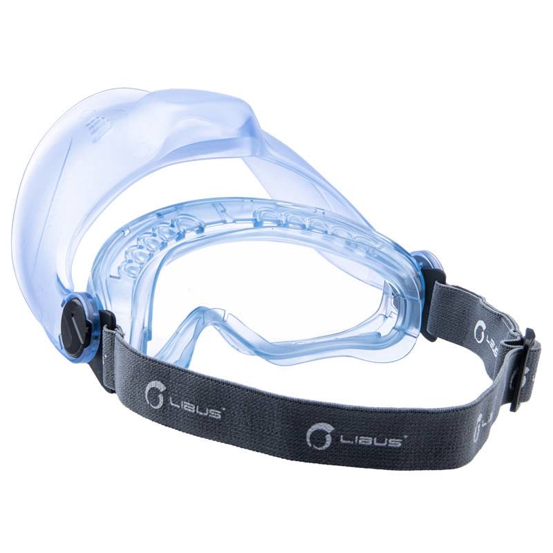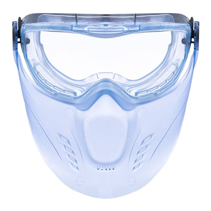 Lente de policarbonato de grado óptico con filtro UV. Marco de PVC. Banda textil elástica. Puente nasal integrado al marco. Ventilación indirecta. Máscara facial en policarbonato. Tratamiento anti-empaño (AF).