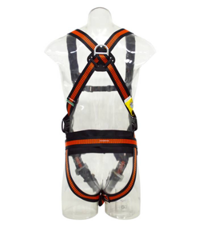 Cinta bicolor para facilitar la colocación del arnés. Diseño ergonómico para facilitar los movimientos del usuario. Pasadores plásticos para retención de la cinta sobrante una vez ajustado el arnés.
