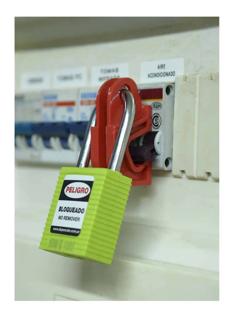Coloque el dispositivo de bloqueo en la manecilla de la térmica o disyuntor a bloquear. Con un destornillador, gire
