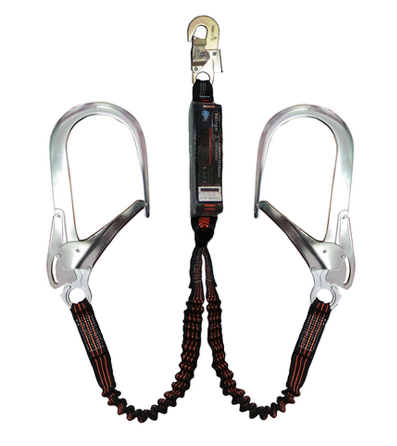 Elemento de amarre anticaídas doble con mosquetón de 110 mm de abertura que permite vinculación a estructuras y puntos de anclaje de mayor diámetro. Cinta elastizada para mayor confort y versatilidad en los movimientos durante su uso. Largo máximo de 1,5 m.