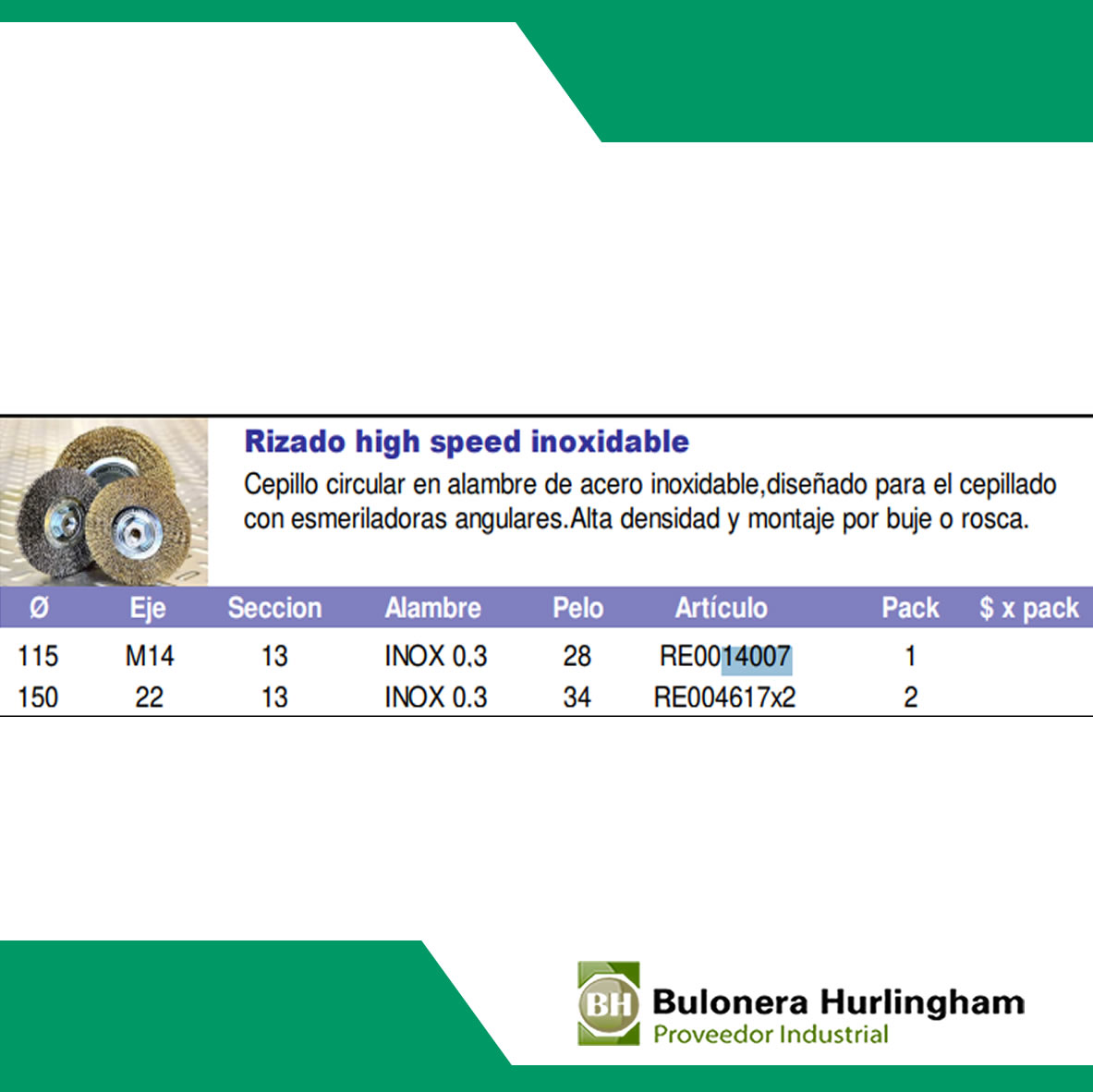 Un cepillo circular rizado "high speed" de FPL es una herramienta utilizada para el desbaste y limpieza en trabajos con amoladoras angulares de alta velocidad. Está hecho con alambre de acero rizado de alta resistencia, diseñado para soportar las altas velocidades de las amoladoras y ofrecer una gran capacidad de arranque.