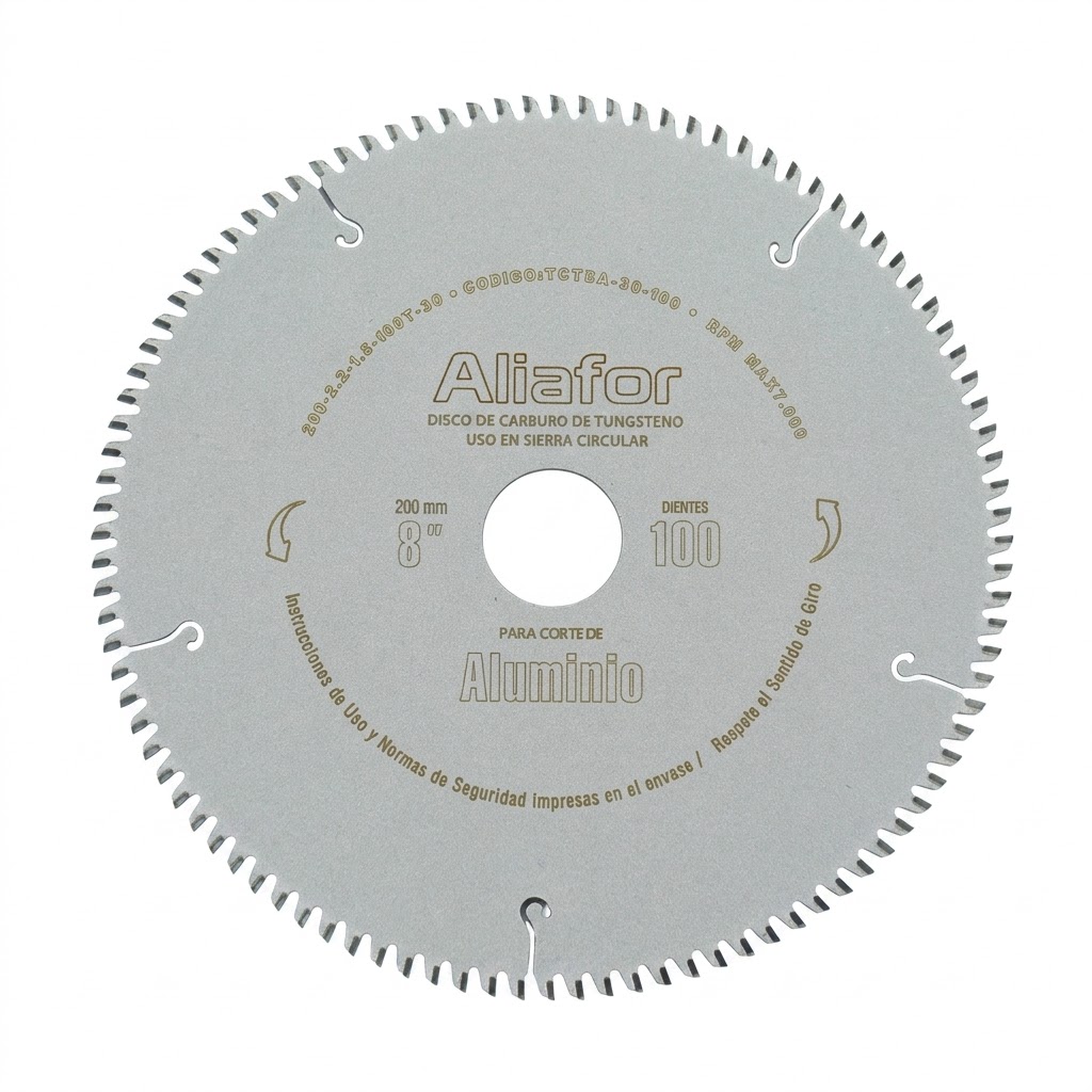 Discos de Sierra Circular Aliafor (TCT). Fabricados con dientes de Widia (Carburo de Tungsteno) de alta densidad, estos discos ofrecen una excelente resistencia al desgaste y un mantenimiento del filo prolongado.