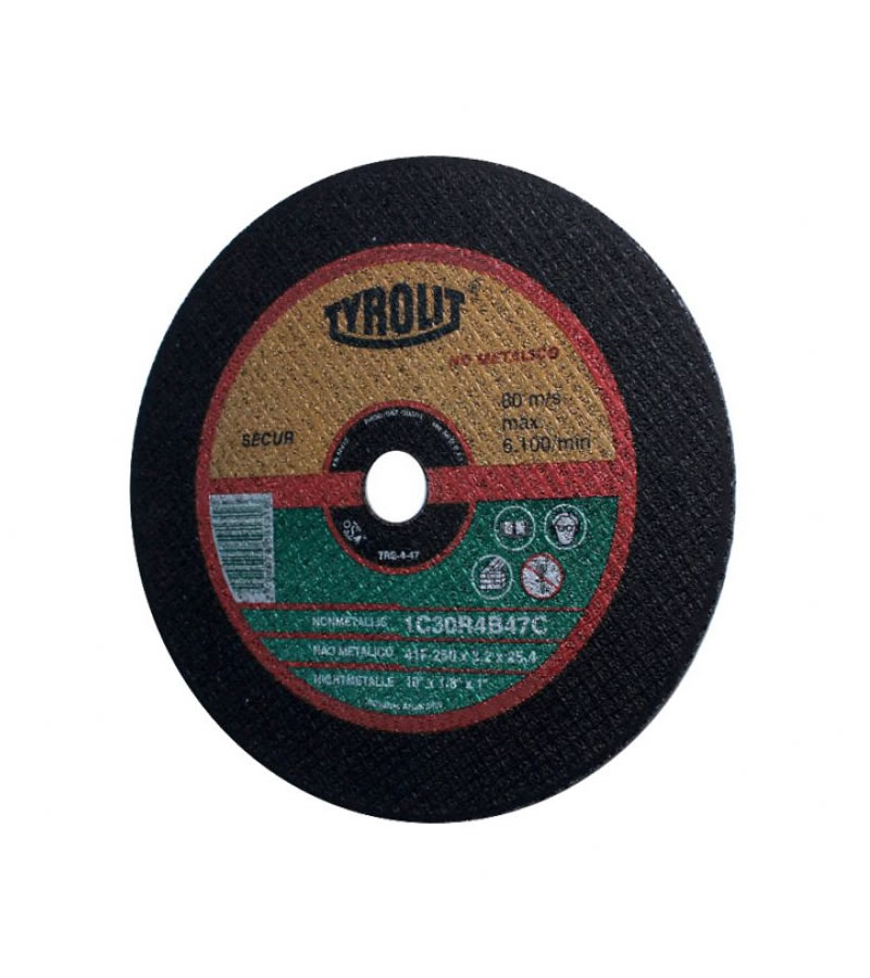 Los Discos Abrasivos TYROLIT SECUR EXTRA Piedras son reforzados e indicados para el corte de piedra natural, mármol, granito, ladrillos refractarios, hormigón, tejas, fibrocemento y no ferrosos (cobre, latón, bronce, etc.).