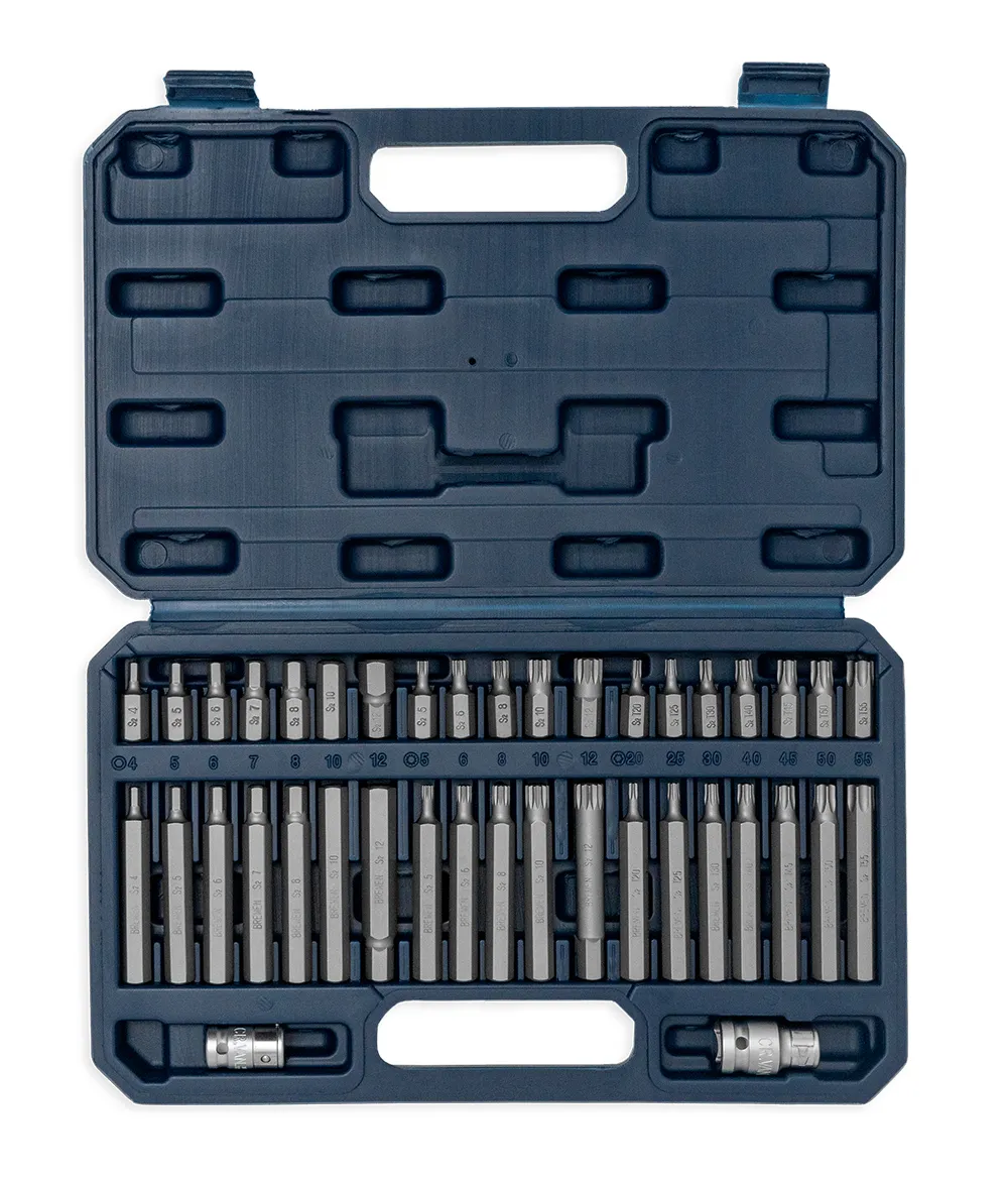 Kit profesional de 40 piezas para el ajuste y desajuste de bulonera especial en mecánica e industria. Fabricadas en Acero S2 de máxima durabilidad, las puntas cubren los perfiles Torx, Allen (Hexagonal) y Multi-Estriada (XZN) en medidas cortas (30 mm) y largas (75 mm). Incluye adaptadores para mandril de 3/8" y 1/2", todo organizado en un estuche metálico de alta resistencia. Es la solución integral para el técnico que busca precisión y resistencia al desgaste en un solo maletín.