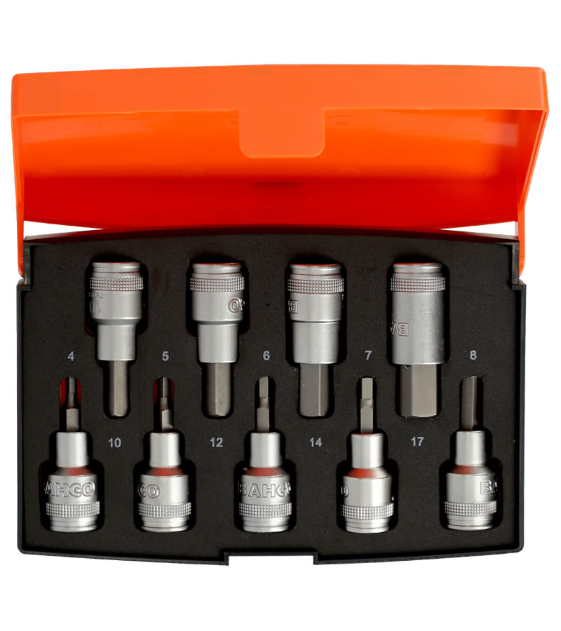 9 bocallaves de 1/2" con puntas hexagonales 4, 5, 6, 7, 8, 10, 12, 14 y 17 mm.