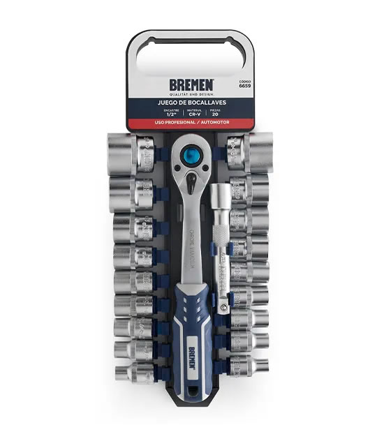El juego de bocallaves con accesorios portátil de 1/2" BREMEN cuenta con 20 piezas de las cuales incluye 18 bocallaves hexagonales de 1/2" de cromo vanadio, lo que le otorga mayor resistencia + 1 Llave crique de 72 dientes + 1 Barra de extesión.