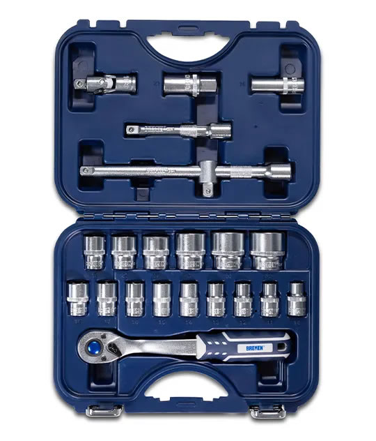 El juego de Bocallaves con Accesorios de 1/2" BREMEN posee una caja reforzada y practico con cierre metálico lo que le da comodidad para poder transportar todos los accesorios.