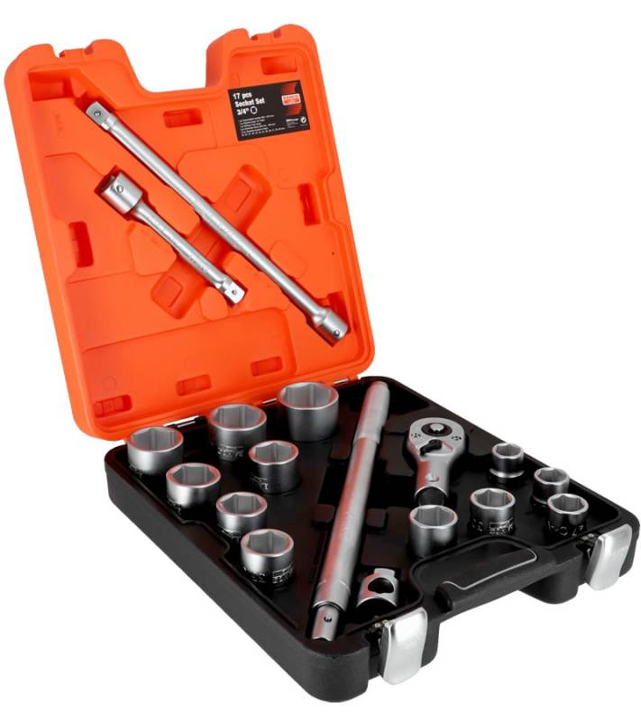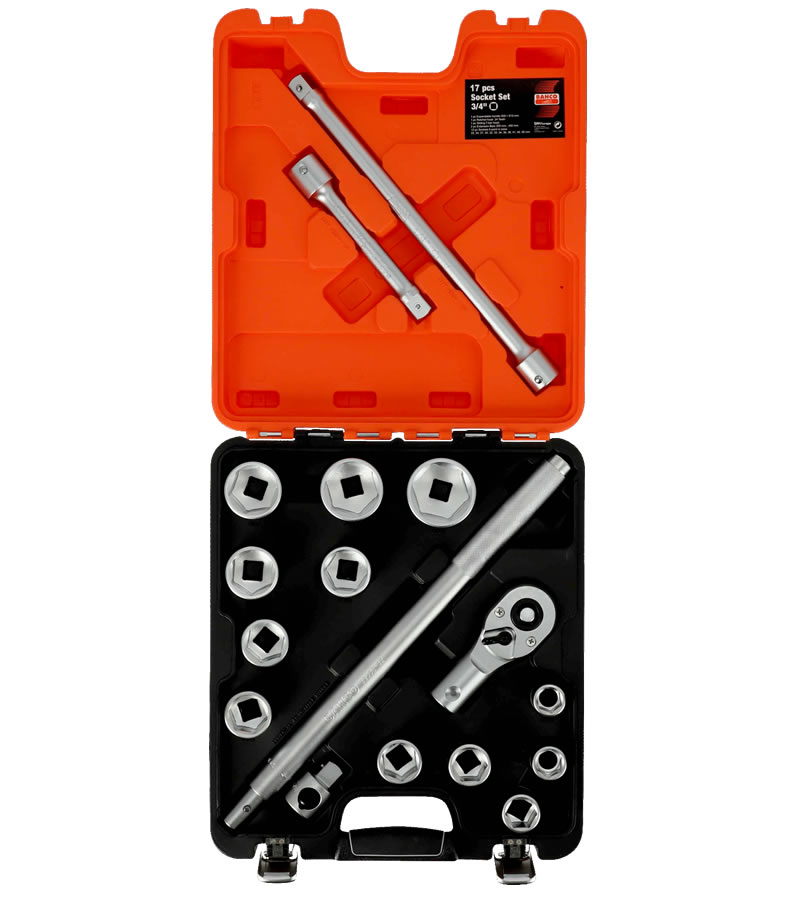 Juego de Bocallaves con cuadrado de 3/4", con perfil hexagonal métrico y cabeza de carraca