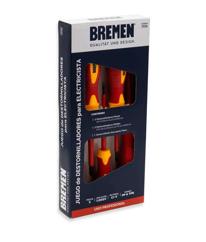 El juego de destornilladores para electricista BREMEN, cumple con las Normas IEC 60900 y VDE que garantizan máxima seguridad para el usuario en uso de hasta 1000V.