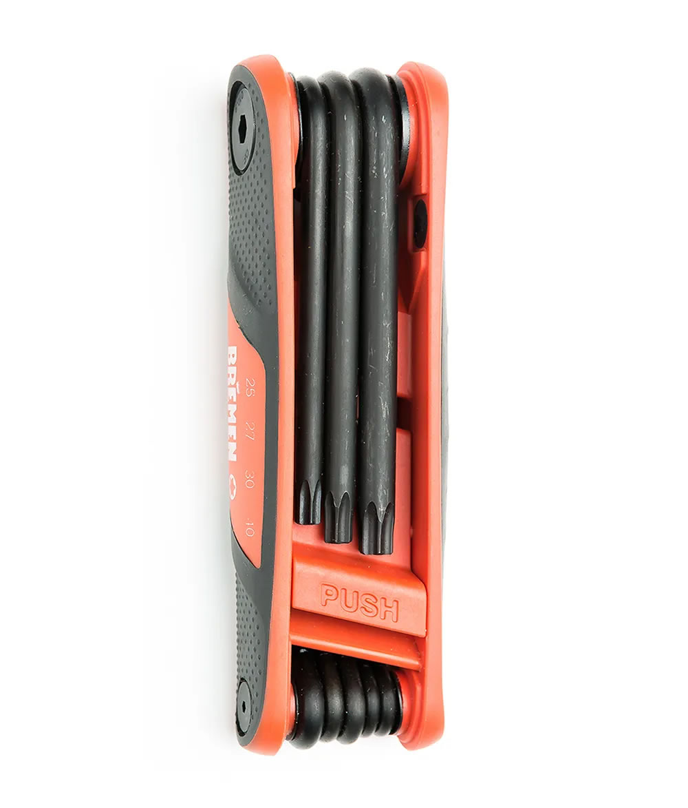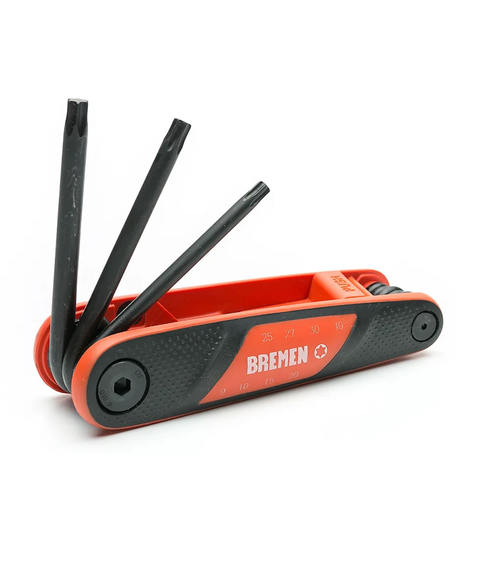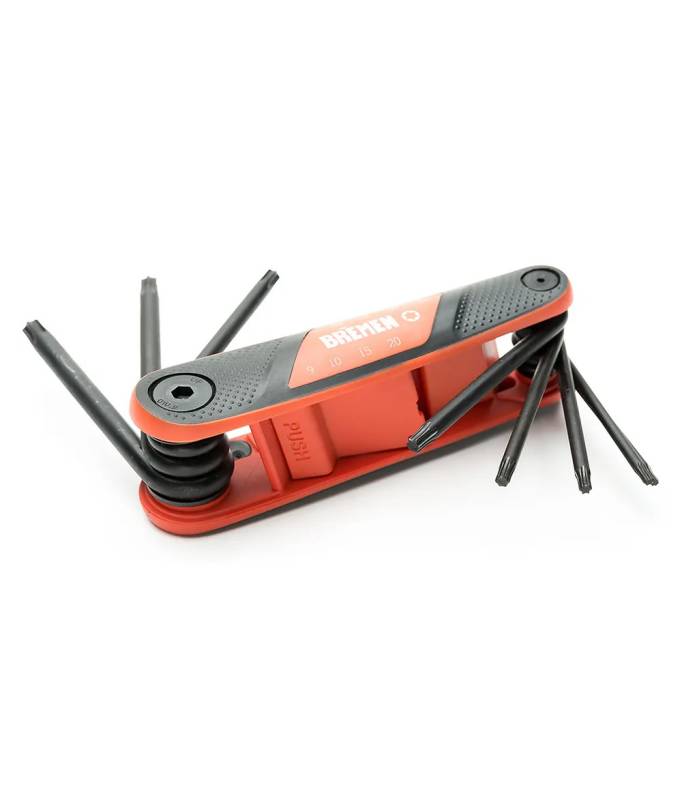 El juego de llaves torx plegables pesado BREMEN es una herramienta completa que cuenta con 8 medidas. Esta fabricada en acero S2, un material que ofrece tanto una buena resistencia al desgaste, como una alta dureza.