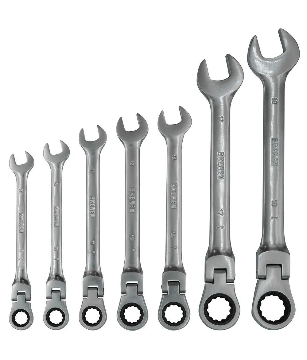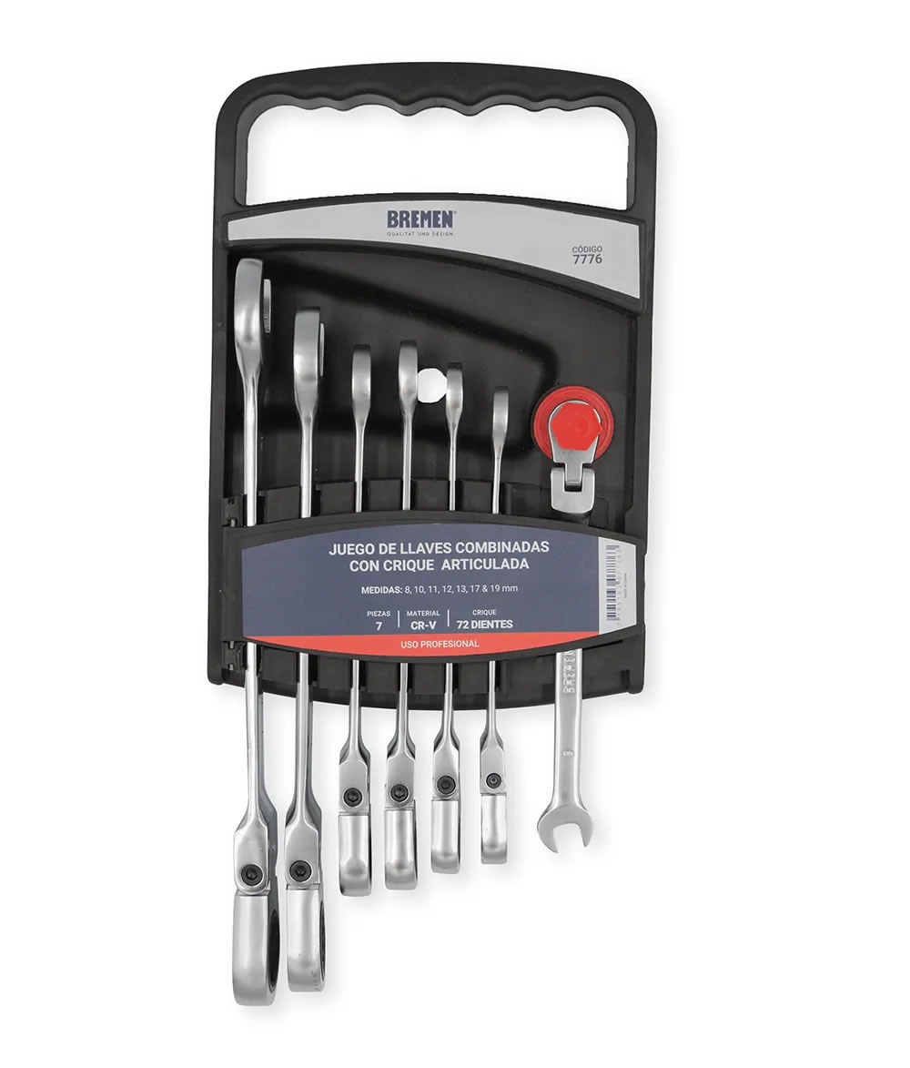 El Juego Llaves Crique Combinadas Articuladas BREMEN® (7Pzs) están fabricadas en acero cromo vanadio, HRC45-51.