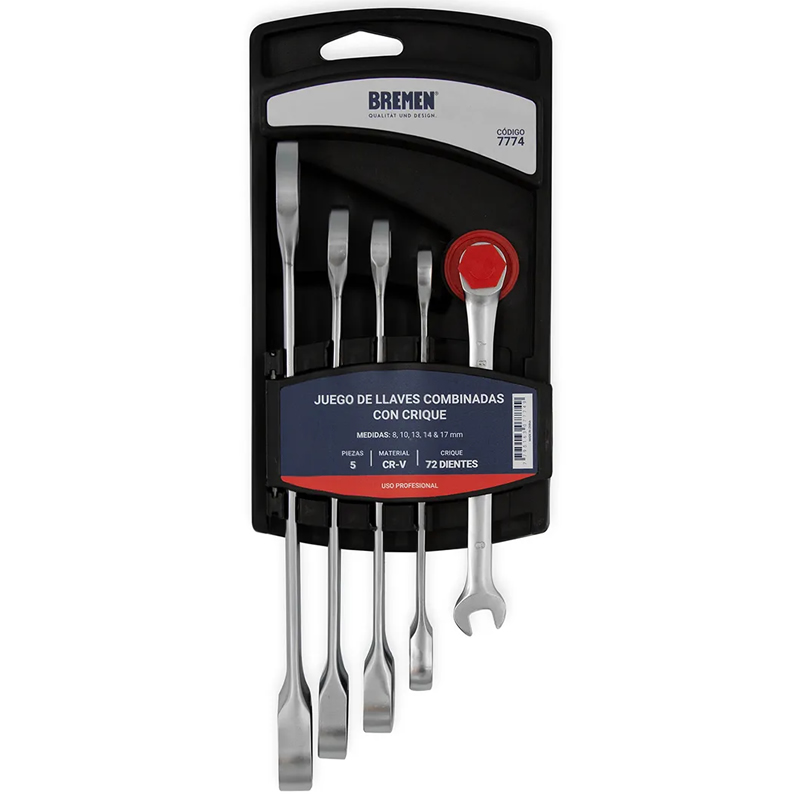 | Los Juego de Llaves Combinadas con Crique BREMEN® vienen en diferentes presentaciones. Todos están fabricados en acero cromo vanadio, HRC45-51.