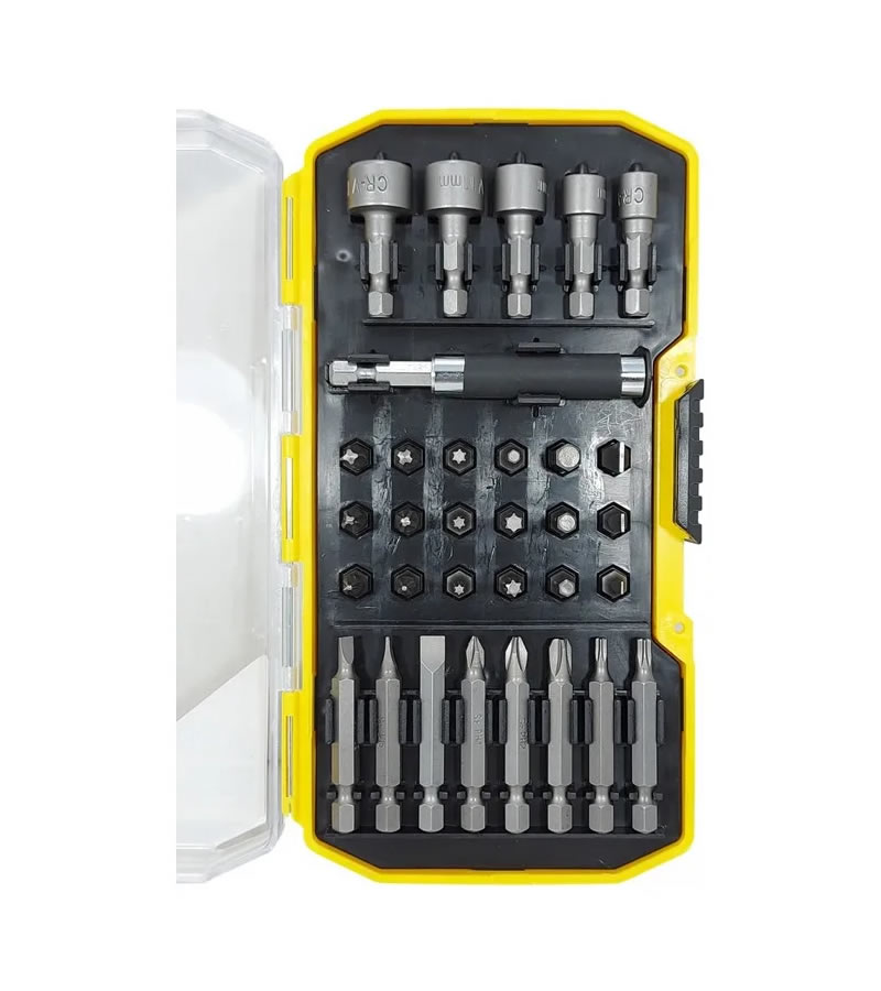 Set Juego Puntas Tubos Atornillador 32 Piezas Barovo Kit' es un conjunto mixto de puntas y tubos bocallave para atornillador, compuesto por 32 piezas. Las puntas están fabricadas en Acero S2 y los tubos en aleación de acero al cromo-vanadio. Ambos componentes han sido sometidos a un tratamiento superficial de blasting. La dureza de las puntas oscila entre 58 - 62 HRC, mientras que la de los tubos varía entre 45 - 50 HRC. El estuche contiene 32 unidades, distribuidas en 18 puntas de 25 mm, 8 puntas de 50 mm, 5 tubos bocallave de medidas 6, 8, 10, 11, 12 mm y 1 adaptador.