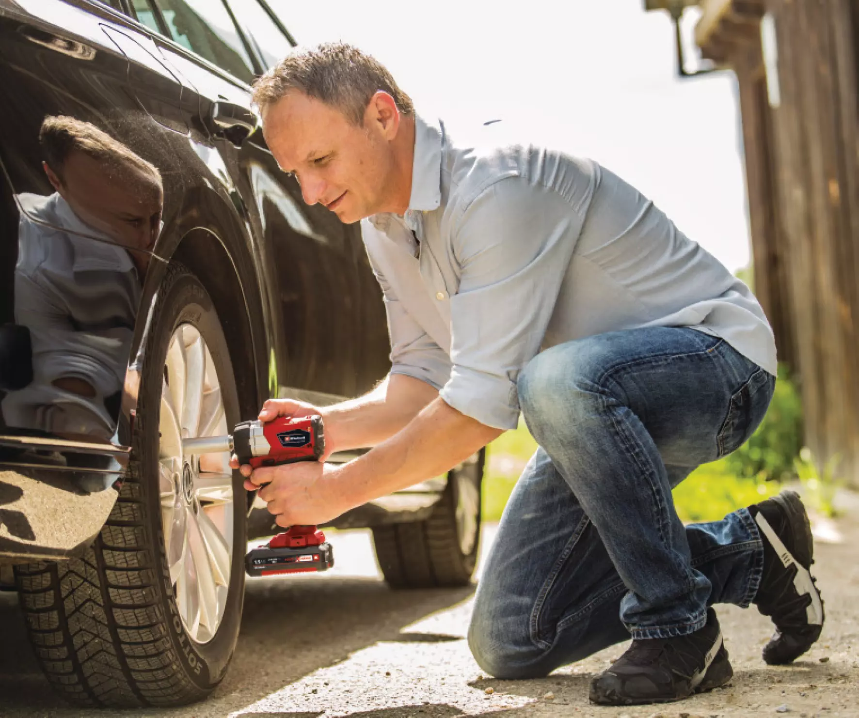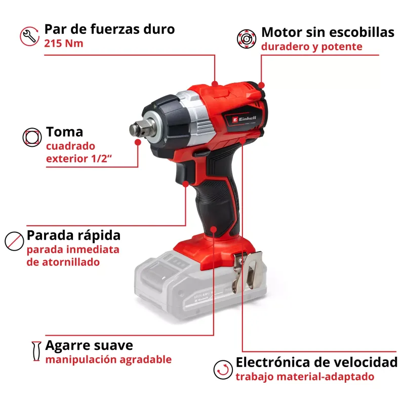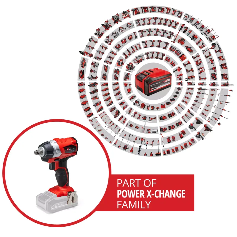 La llave de impacto sin cable Einhell TE-CW 18 Li BL-Solo es el complemento ideal para el cuidado y mantenimiento domestico de los vehiculos del hogar. En lugar de invertir tiempo y energía en el cambio de llantas en primavera y otoño, las tuercas se pueden aflojar con esta práctica herramienta en un abrir y cerrar de ojos. La potente llave de impacto ofrece una alternativa cómoda a un aflojamiento manual laborioso. Con el motor sin escobillas, la llave de impacto proporciona una potencia mayor y una vida útil más larga que la de un motor convencional de escobillas de carbono. Además, la llave de impacto a batería forma parte de la familia Power X-Change: la batería con tecnología de iones de litio de alta calidad y un cargador puede utilizarse en todos los modelos Power X-Change. La ventaja es obvia: Los cables molestos, el riesgo de tropezar y las deformaciones no deseadas debidas al espacio limitado para el movimiento ahora son cosa del pasado gracias a la nueva, potente y duradera generación de herramientas a baterías de Einhell. Esto permite un trabajo rápido y seguro en todas las ruedas. El alto par de torsión de la poderosa llave de impacto a batería proporciona la potencia suficiente para aflojar las tuercas agarrotadas, encajadas u oxidadas en un instante. A pesar de su potencia, la TE-CW 18 Li BL-Solo es ligera por su calibre y, por lo tanto, fácil de manejar. La llave de impacto tiene una robusta recepción de cuadrado exterior de 1/2", y en el envío se incluye un adaptador de brocas para atornillar. La luz LED integrada para iluminar el área de trabajo también permite un cambio rápido de llanta si se da el caso: al anochecer, en la oscuridad o en garajes sin la iluminación adecuada. Se suministra sin batería ni cargador (se venden por separado).