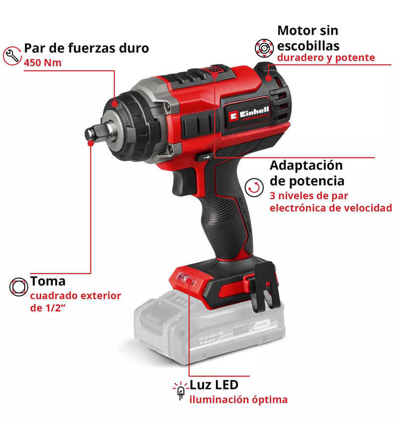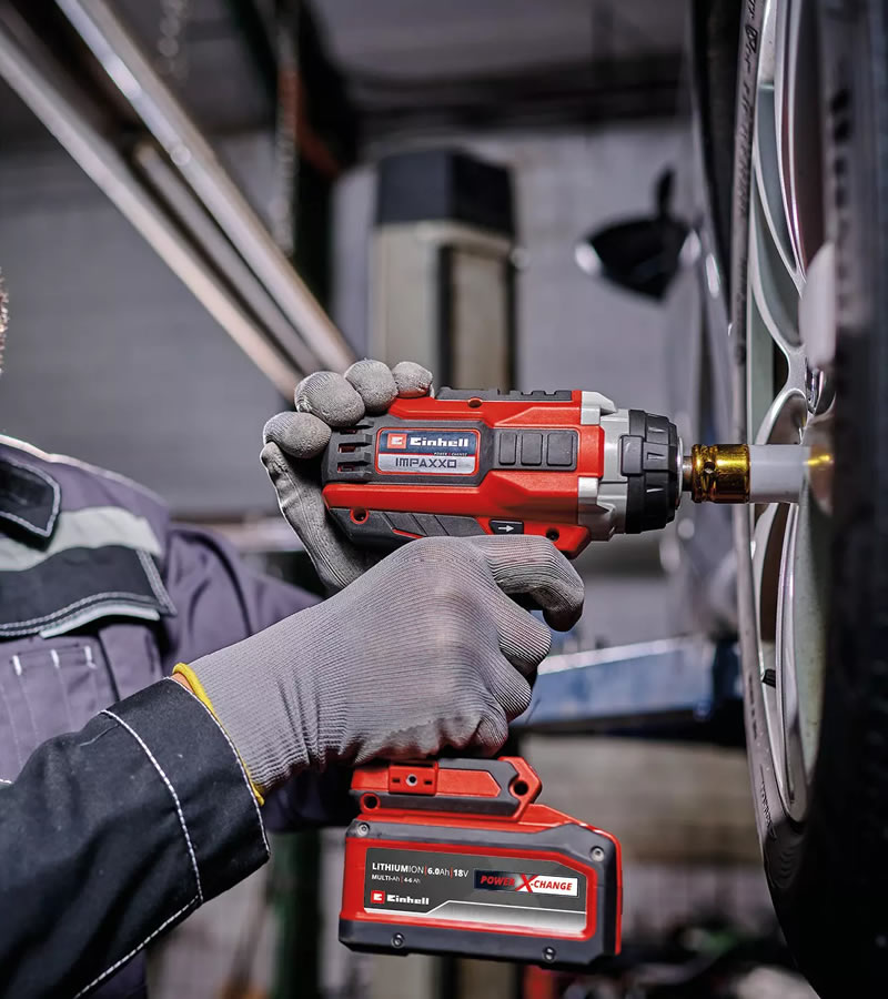 El atornillador de impacto con batería IMPAXXO 18/450 Einhell Professional enrosca sin esfuerzo grandes o largos tornillos y cuida, al contrario de taladros percutores, las articulaciones del profesional durante el uso. Como miembro de la familia Power X-Change, cada batería de la potente serie de alta calidad puede combinarse con el atornillador de impacto. Un atornillador de impacto con batería es apropiado para múltiples usos en el hogar, taller y, ante todo, en el garaje. El equipo se acciona por el motor sin escobillas de Einhell. Este motor sin escobillas ofrece más potencia y una vida útil más prolongada que los motores de escobillas de carbono convencionales. Tras un registro online se aplican 10 años de garantía en el motor sin escobillas. El alto par facilita el aflojamiento sencillo de las tuercas de ruedas. Óptima adaptación de velocidad o par de la aplicación con 3 niveles. El par máximo es de 450 Nm, mientras que el par de aflojado es de 800 Nm. El atornillador de impacto con batería dispone de una robusta recepción cuadrada exterior de 1/2" y de una luz LED para la iluminación óptima de la zona de trabajo. En el envío está incluido un adaptador de puntas para el atornillado y un práctico set de llaves para el cambio de neumático de coche. El envío se realiza sin batería ni cargador. Estos son adquiribles por separado, p. ej., como práctico set para principiantes con distintos tamaños.