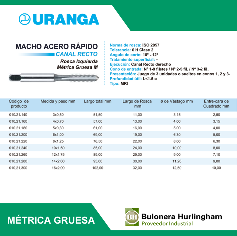 | 2010212602 | MACHO ACERO RAPIDO M 12X1.75 IZQUIERDO -- URANGA |