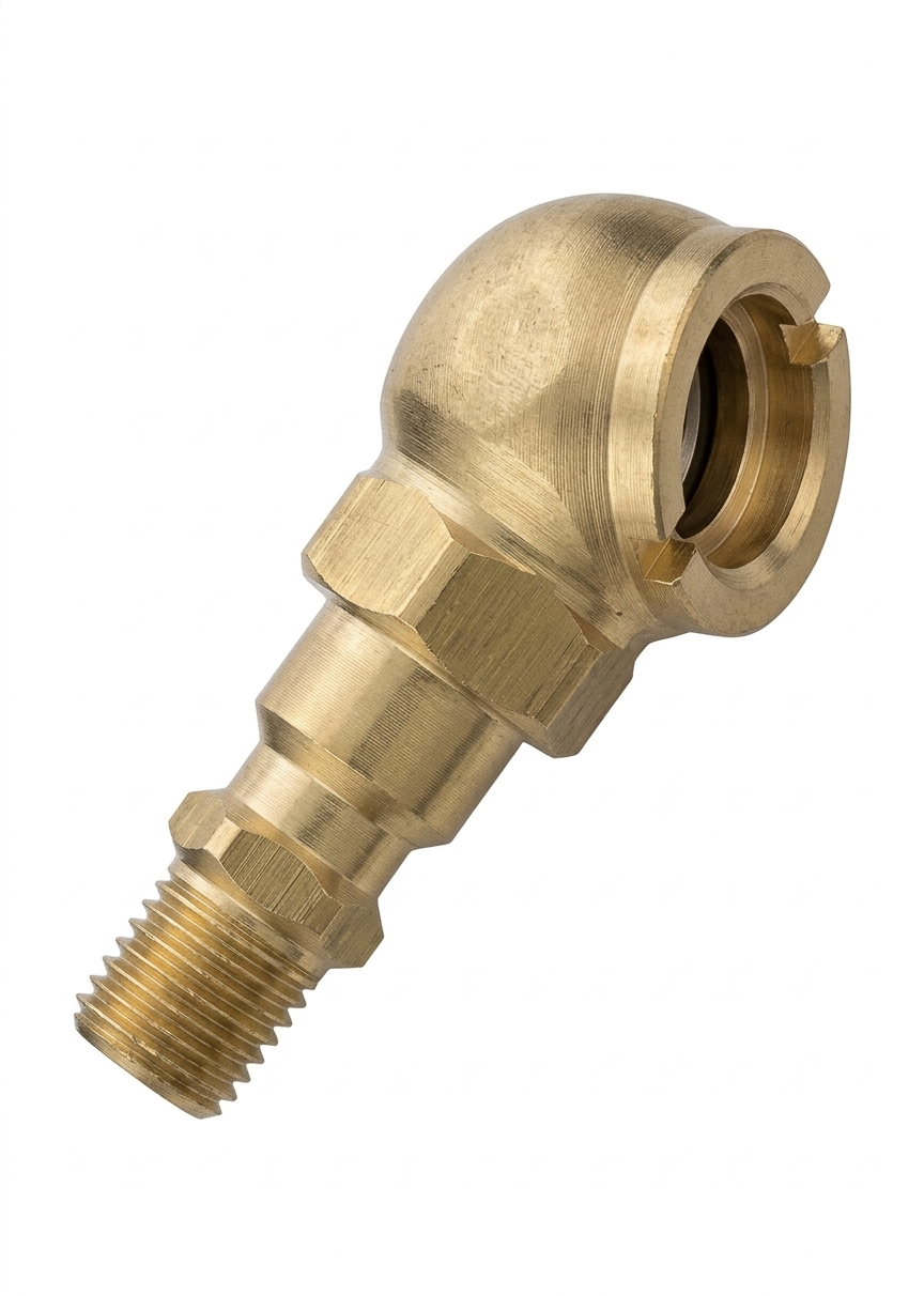 Cabezal inflador profesional fabricado íntegramente en bronce macizo para máxima durabilidad. Su diseño esférico permite un sellado hermético e instantáneo sobre la válvula del neumático, facilitando el inflado desde diversos ángulos. Viene equipado con un terminal para acople rápido estándar de 1/4", lo que permite conectarlo y desconectarlo de la manguera de aire en segundos. Es la herramienta estándar para gomerías y talleres mecánicos por su robustez ante el uso intensivo y caídas.