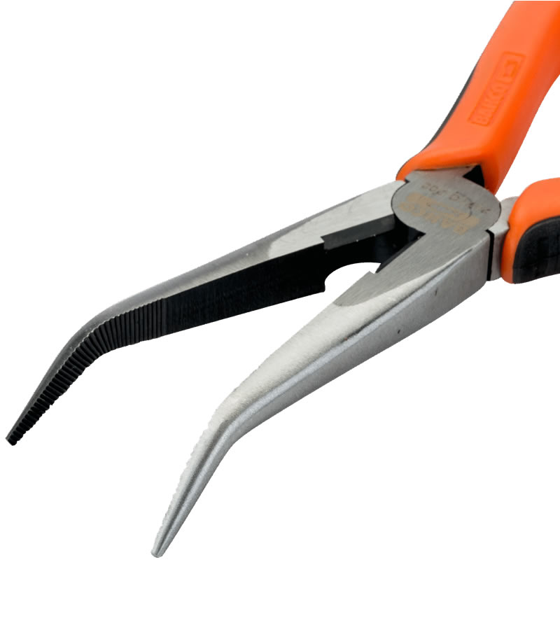 Alicates de boca semirredonda con puntas curvadas en ángulo a 60° con mangos bi-componente