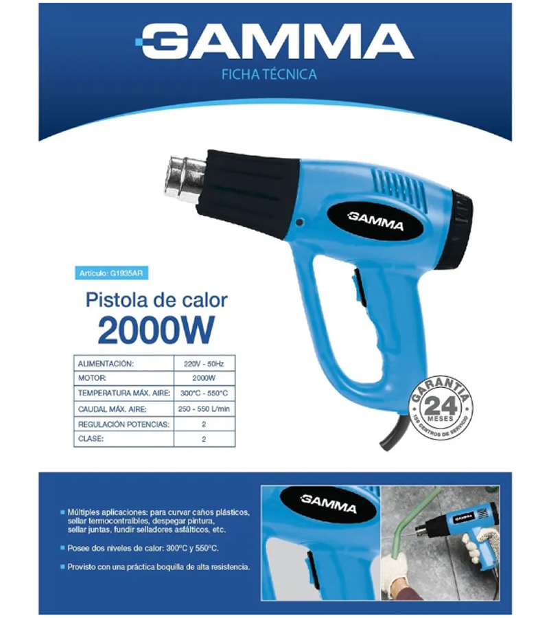 Recomendado para curvar caños plásticos, sellar termo contraíbles, despegar pintura, sellar juntas, fundir selladores asfálticos etc. Motor 2000W.