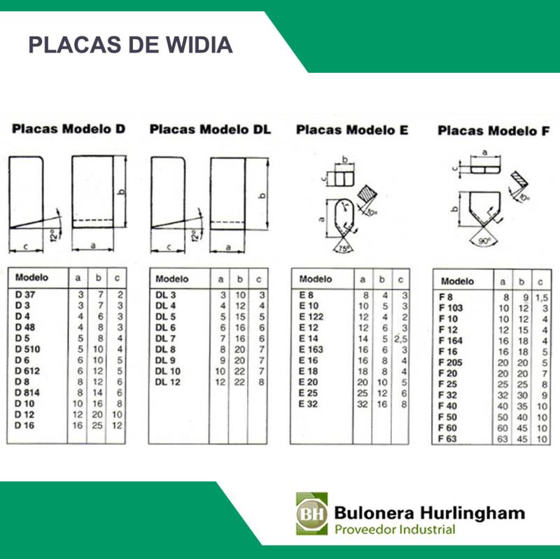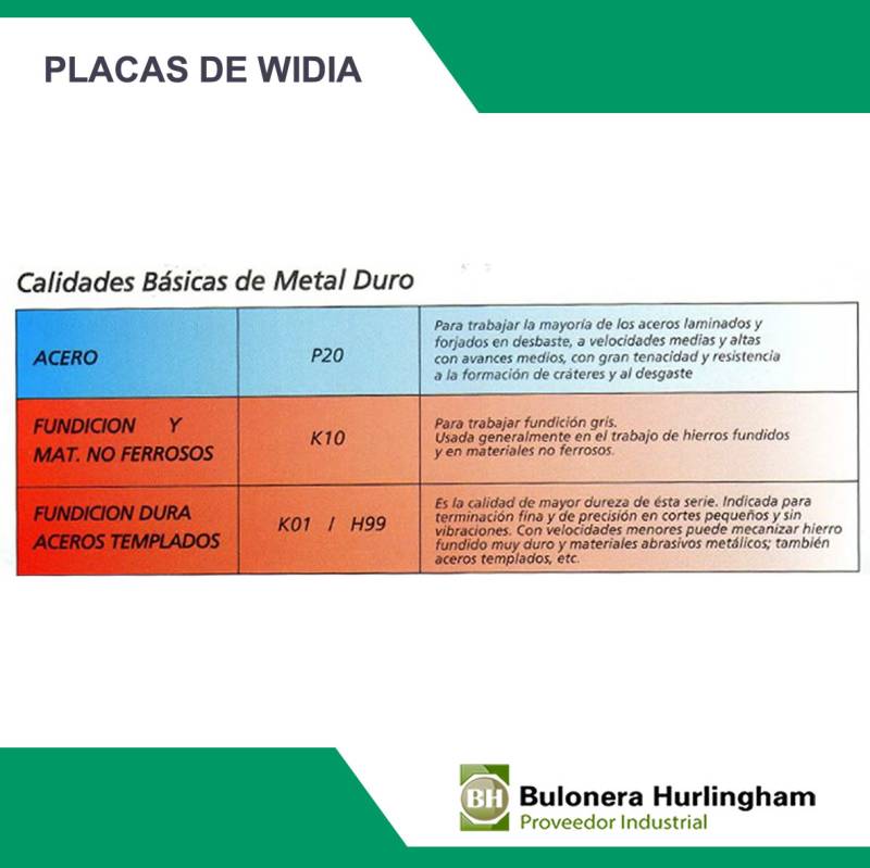 Placas de metal duro (widia) diseñadas para operaciones de torneado en una amplia gama de materiales, con distintas calidades que aseguran el rendimiento óptimo según el tipo de mecanizado y material trabajado.