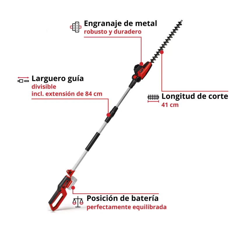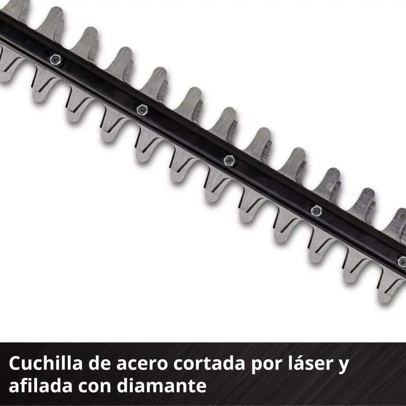 El cortasetos de altura inalámbrico de Einhell forma parte de la flexible y potente serie de sistemas Power X-Change de Einhell. Dentro de la familia PXC, las baterías de alta calidad con celdas de iones de litio se pueden combinar con todos los dispositivos del sistema. Las cuchillas del cortasetos de altura están fabricadas en acero cortado con láser y rectificado con diamante, la longitud máxima de corte es de 410 mm con un máximo de 1.400 cortes por minuto. El cabezal del motor se puede inclinar 7 veces y se puede utilizar de forma flexible con el mango principal giratorio. La superficie de sujeción adicional de goma favorece un agarre seguro y firme y, junto con la correa de transporte, favorece el trabajo ergonómico. El robusto engranaje metálico está diseñado para una larga vida útil. Gracias a la pértiga alargadora, el cortasetos de altura también es adecuado para setos más altos. En el envío se incluye un carcaj resistente para un almacenamiento seguro y un transporte sencillo.
