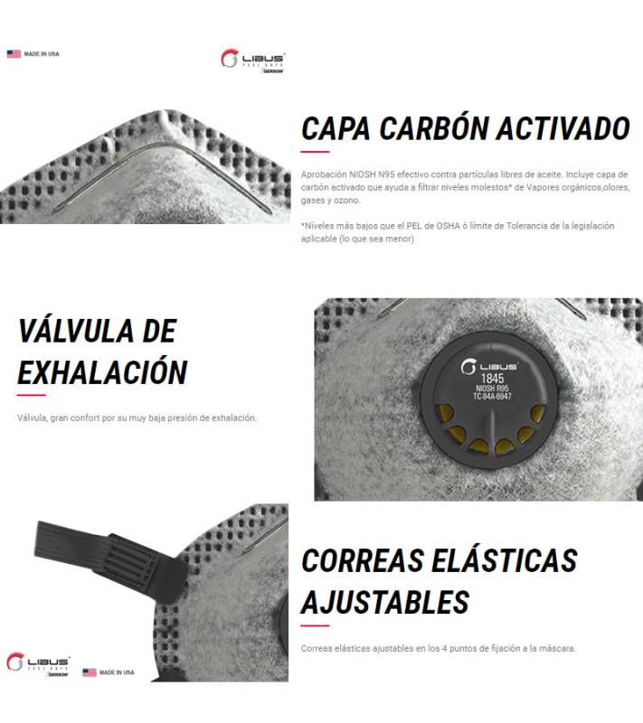 ✓ Capa de carbón activado que brinda alivio para niveles molestos de vapores orgánicos, gases ácidos y ozono.