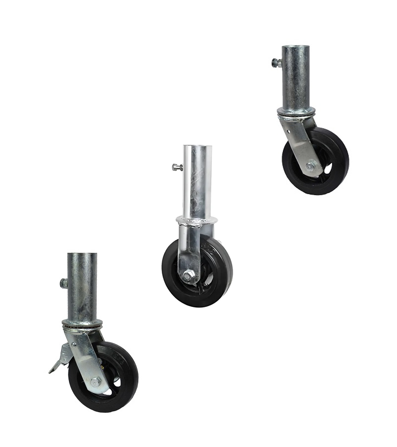 Soporte de acero estampado de 4,75mm de espesor, alas soldadas. Acabado zincado. Soporte giratorio de doble hilera de bolas. Caño de 2” para alojamiento de andamio.