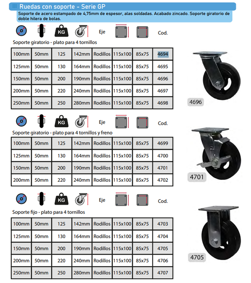 | >4694 | RUEDA 100MM X 40MM HIERRO/GOMA GIRATORIA (C/125KG) 4694 |