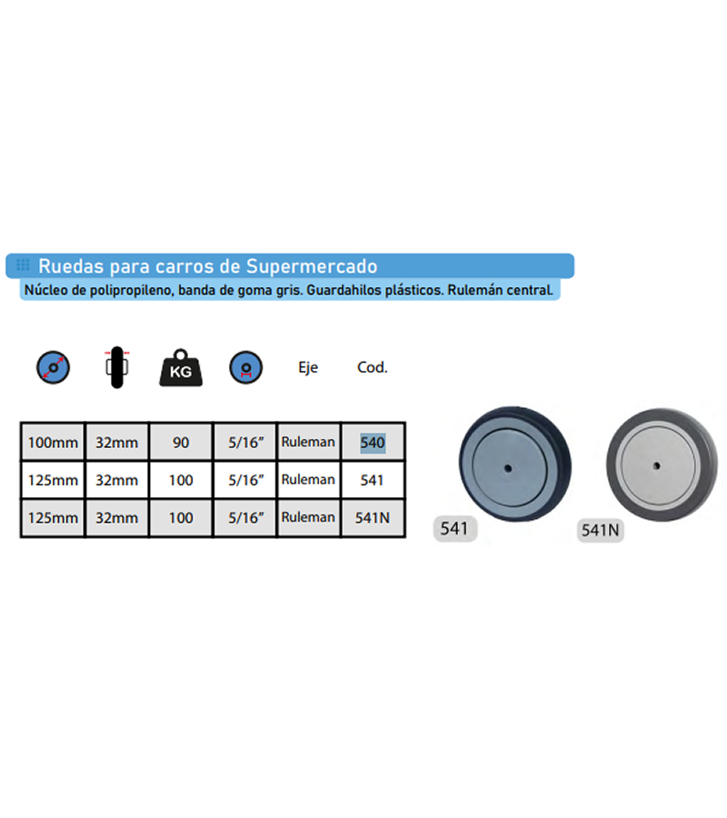 | >540 | RUEDA 100MM X 32MM POLIP. GOMA GRIS P/SUPERM. C/RUL.SUELTA (C/90KG) 540 |