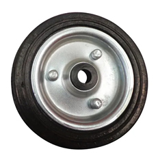 Aro de goma negra. Llantas metálicas de acero estampado. Acabado zincado. Eje liso.