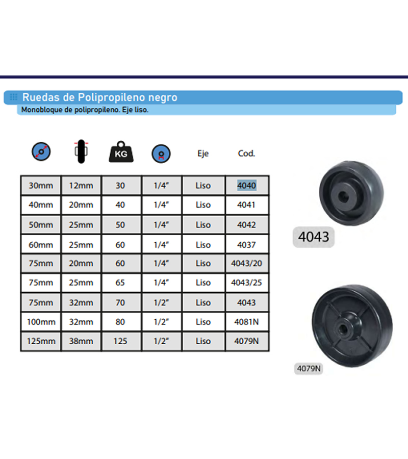 | >4041 | RUEDA 40MM X 20MM SUELTA POLIPROPILENO (C/40KG) 4041 |