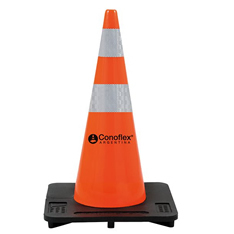 Fabricado con material de polietileno semiflexible de alta calidad, con aditivo UV para protección solar, garantizando una excelente resistencia frente a las condiciones climáticas severas y la exposición a la intemperie. Conformado en dos piezas, cono y base de contrapeso.