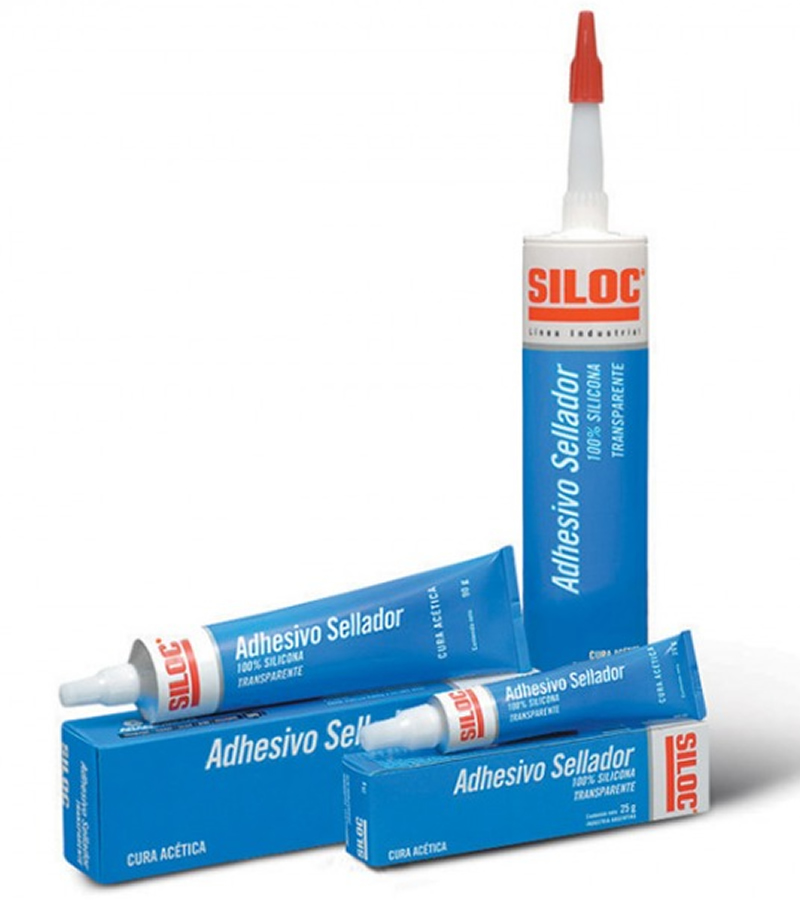 Silicona acética SILOC, 100% silicona por 100grs. Fuerte, flexible, inalterable. Resiste al agua, a la intemperie y a la radiación UV sin envejecer, perder adhesión, agrietarse o cuartearse.