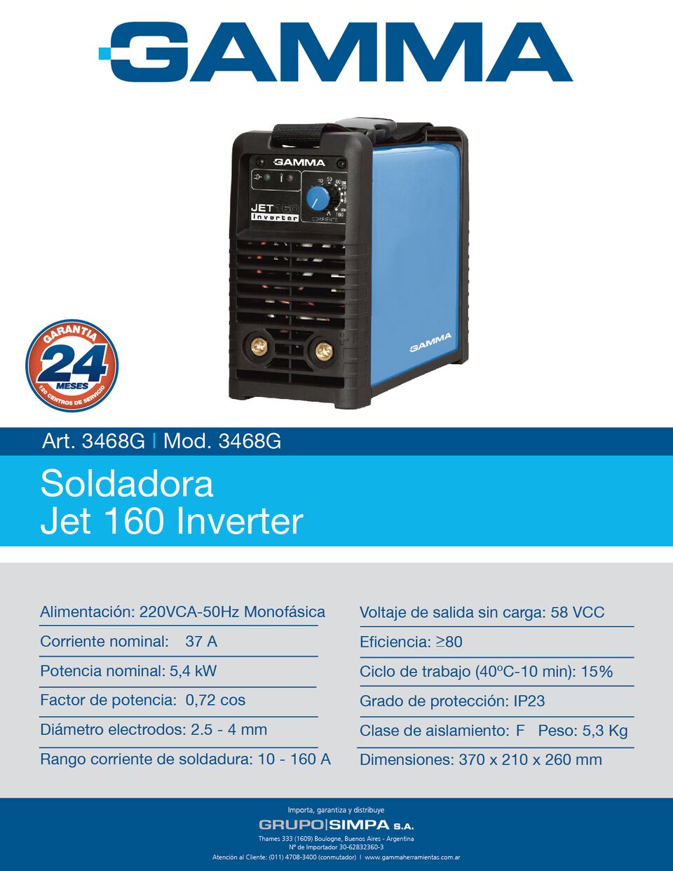 Ciclo de trabajo (40ºC - 10 min): 160 A - 25% / 80 A - 100%
