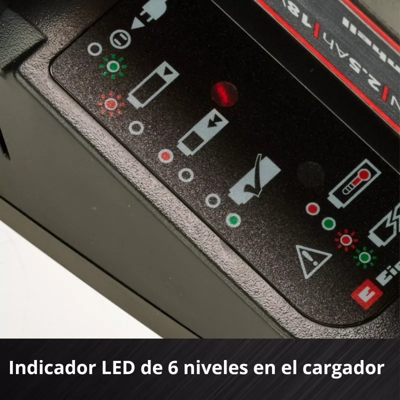 Indicador LED: Un sistema de 3 luces te permite verificar el nivel de carga en tiempo real.