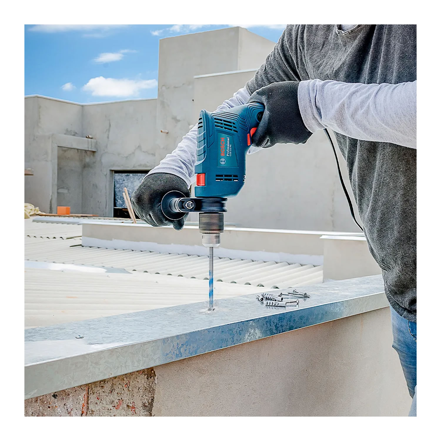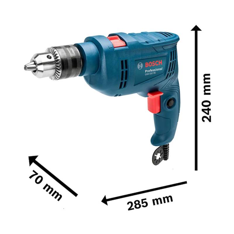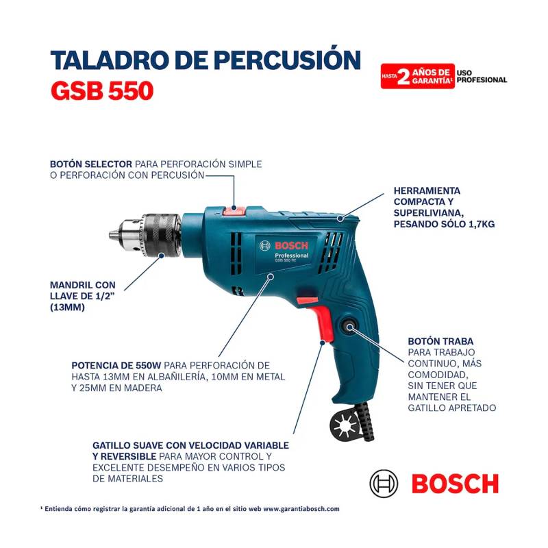 El Taladro Percutor Reversible Bosch GSB 550 RE, con potencia de 550 W, es la mejor elección para quien busca la confianza de la marca Bosch por un precio imbatible. Cómodo y liviano, con apenas 1,7 Kg, perfora mampostería, madera y metal, con y sin impacto, gracias al botón conmutador. Realiza también atornillados a través de la función de reversión y realiza trabajos continuos con la ayuda del botón de bloqueo. Todo esto con 1 año de garantía y soporte de la Asistencia Técnica Bosch, que ofrece el servicio más rápido y barato del mercado.