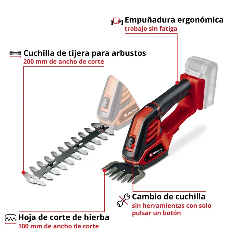 Tijera cortacésped y cortacerco inalámbrica 18 V Einhell GE-CG 18/100 Li Solo para el corte sistemático de arbustos y césped. Tiene un engranaje de metal robusto para una transmisión de potencia óptima para las cuchillas cortadas con láser y diamante molido. Incluye una cuchilla para cortar hierbas y cuchillas para cortar arbustos. Fácil conversión de las tijeras de hierba a las tijeras de arbustos gracias al sistema especial de cambio de cuchillas que no requiere herramientas. Tiene un interruptor de seguridad protege al usuario de iniciar las tijeras sin intención. Herramienta compatible con las baterías Power X-Change. No incluye la batería ni cargador.