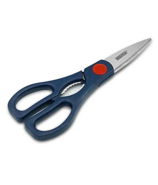 Tijera multiuso fabricada en acero inoxidable, con filo templado para mayor durabilidad.