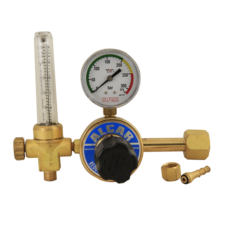 Válvula reductora de presión profesional para gas carbónico (CO2), diseñada específicamente para procesos de soldadura semiautomática. Fabricado en bronce forjado con diseño antiescarcha, integra un caudalímetro de columna graduado que permite un control visual exacto del flujo entre 0 y 30 LPM. Este equipo DUPLEX garantiza una protección de arco superior, eliminando la porosidad en el cordón y asegurando un ahorro crítico de gas mediante una regulación micrométrica y estable.