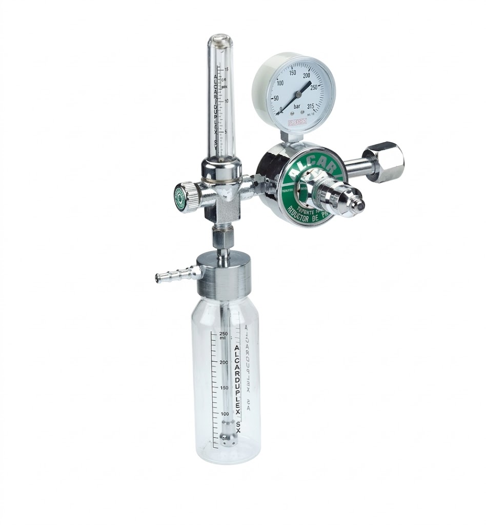 Equipo de oxigenoterapia de grado hospitalario diseñado para la reducción y control preciso de oxígeno medicinal. Este conjunto DUPLEX incluye un regulador de alta presión, un flujómetro de columna para dosificación exacta en litros por minuto (LPM) y un frasco humidificador para prevenir la resequedad de las vías aéreas. Fabricado bajo estrictas normas de seguridad biológica y mecánica, es el equipo de referencia para internación clínica y cuidados domiciliarios prolongados.